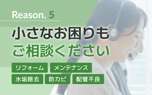 お住まいに関するお困りごとやお悩みがございましたら、どのような小さなことでもお気軽にご相談ください。リフォームや住まいのメンテナンスは、日常の生活を快適に保つために欠かせないものですので、豊富な経験と専門知識を持つスタッフが丁寧に対応し、より良い解決方法をご提案いたします。カビや水垢の除去、配管の不具合、古くなった設備の交換といったご相談も承っています。